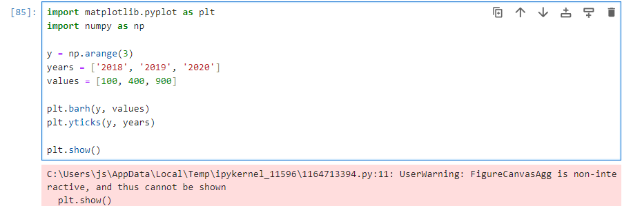 이 경고는 보통 파이썬 주피터 환경에서 그래프가 제대로 표시되지 않을때 발생한다.